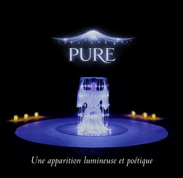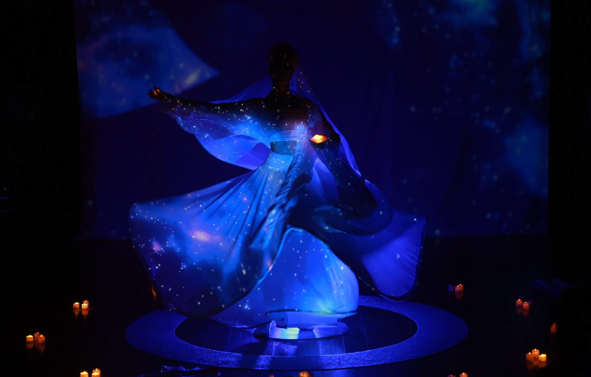 Le dispositif intègre, selon les configurations, un travail de projections lumineuses contemporaines, diffusées sur les tissus, le corps et le visage de la danseuse. Ces projections libres dialoguent avec le mouvement circulaire et développent un univers visuel inspiré du cosmos, de la géométrie sacrée, de l’eau et des forces naturelles.