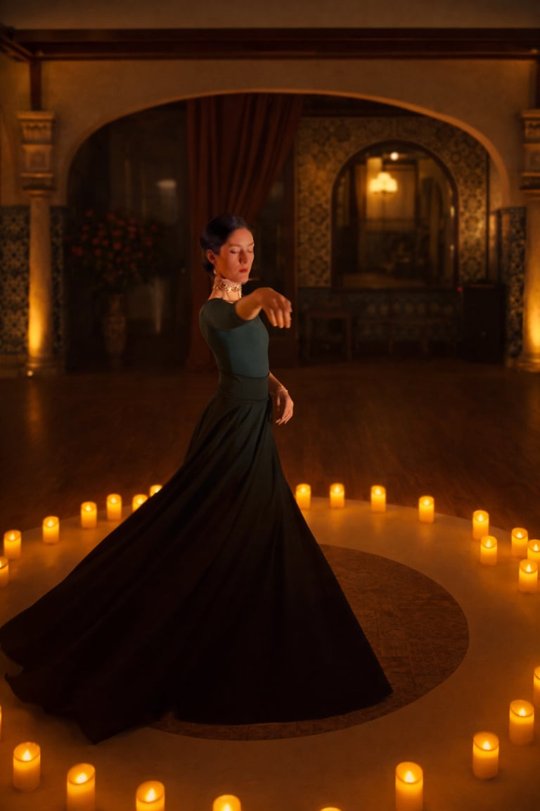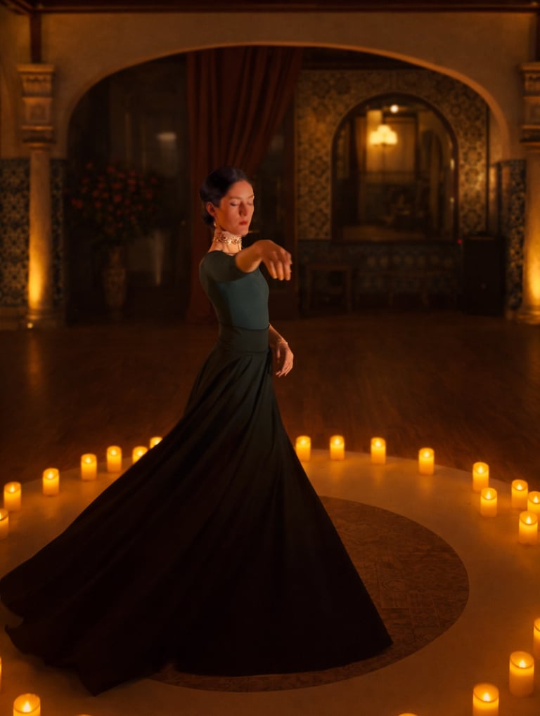 Sobriété et élégance : une danse tout de noir vêtue, accompagnée d'un répertoire de musique au piano et cordes, entourée d'un cercle de bougies LED.
