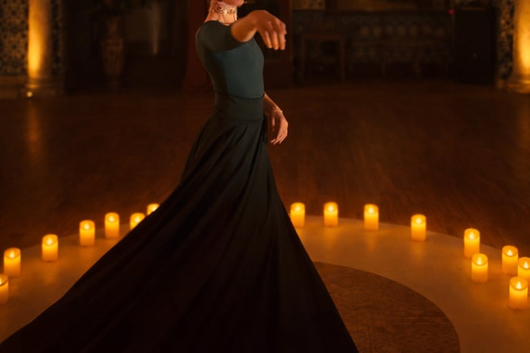 Le dispositif intègre, selon les configurations, un travail de projections lumineuses contemporaines, diffusées sur les tissus, le corps et le visage de la danseuse. Ces projections libres dialoguent avec le mouvement circulaire et développent un univers visuel inspiré du cosmos, de la géométrie sacrée, de l’eau et des forces naturelles.