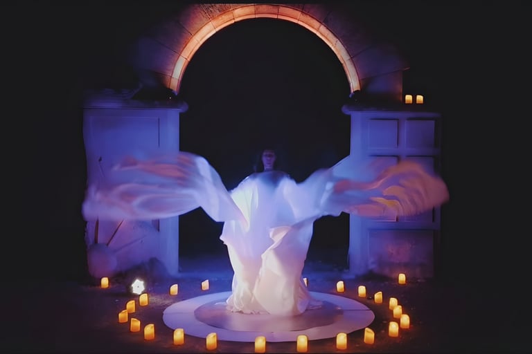 Un voyage au coeur du sacré avec des voilages de soie blancs illuminées, au son de musique classique et de chants sacrés.